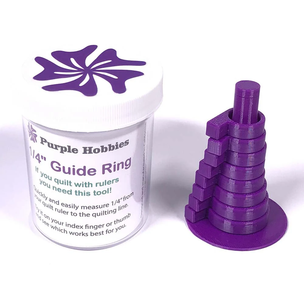 If you use quilt rulers you need these rings! Place a 1/4” Guide Ring on the tip of your finger to easily measure the 1/4” from the ruler to where the quilt line will be sewn. Also works great for hand sewing to measure 1/4” seams. Try a 1/4” Guide Ring on your index finger or on your thumb. The set includes 8 different sizes so you can choose the perfect fit. The sizes are marked inside each ring so you can order more of a specific size if desired. Includes a stand to hold all the rings in order and a clear plastic jar to store them.