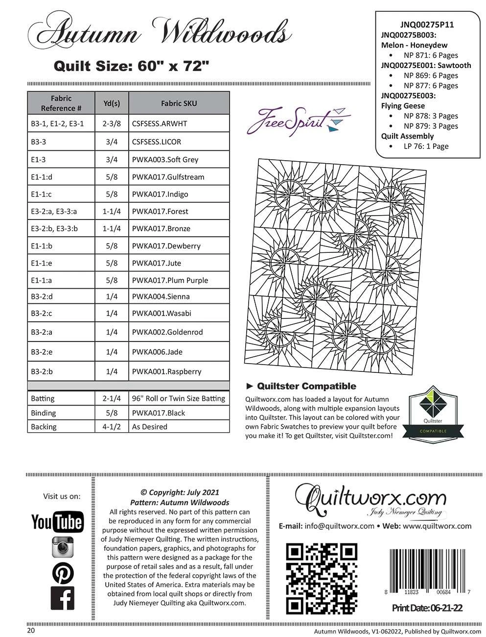 Pattern Includes: Instructions, Cover Sheet, Yardage Information, Foundation Papers Size 60 x 72