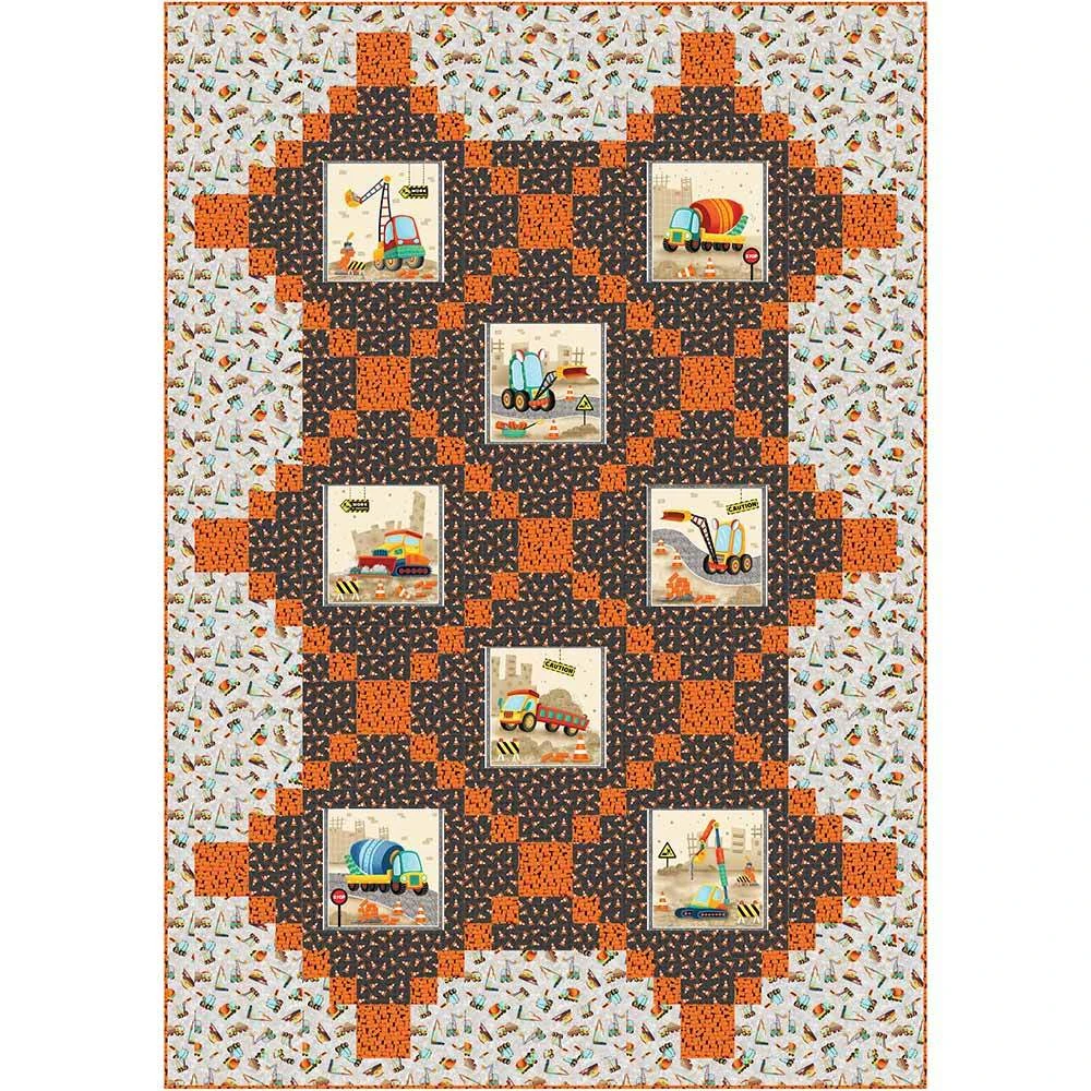 Eight unique construction zones are featured in this advanced beginner level project. Great for a kids playroom. The Big Wig Kit includes pattern by Susan Ziegler and all the fabrics needed, including printed panel, for the top and binding from the Another Brick in the Wall collection by Nidhi Wadhwa. Finished size is 56″ x 80″. Backing is available separately, 5 yards of a 44″ wide is recommended.