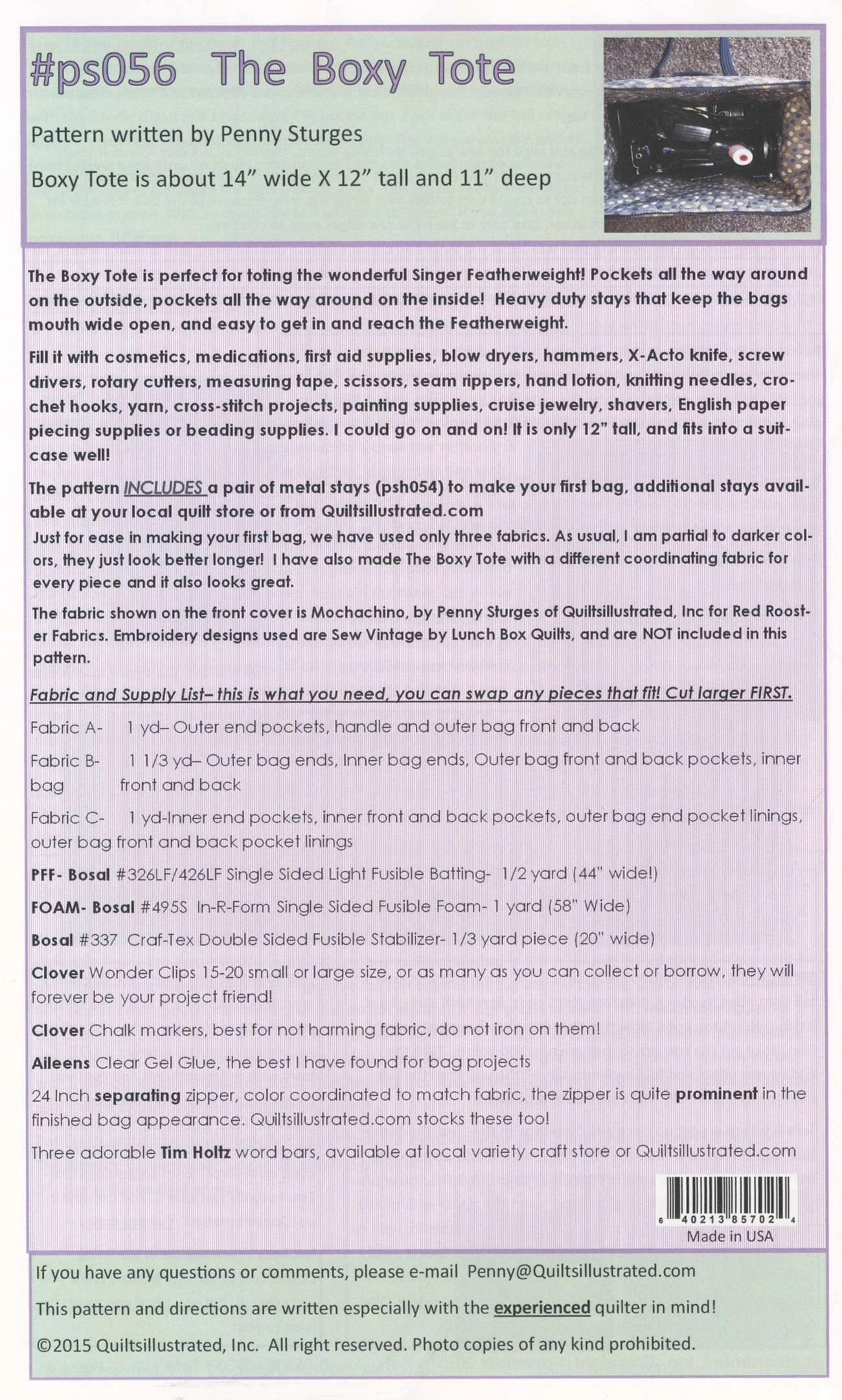 The Boxy Tote was designed to hold a Singer Featherweight Sewing Machine. It has a rigid metal frame that holds the mouth of the bag open and offers protection for its contents. This Boxy Tote is great for knitting projects, sewing supplies, also the best diaper bag ever. The pattern includes 2 metal stays (PSH054) to make your first bag. Approximate finished size: 14in wide x 12in tall x 11in deep.