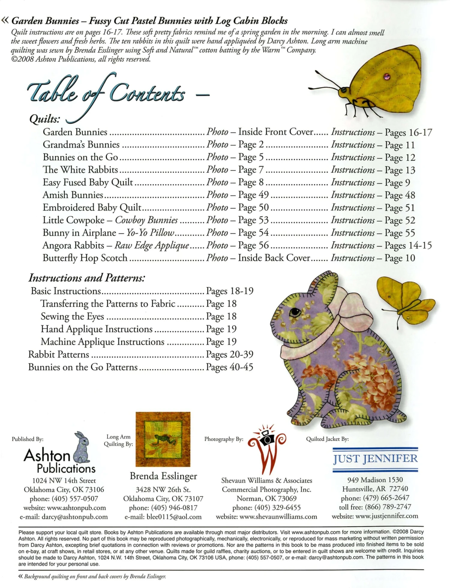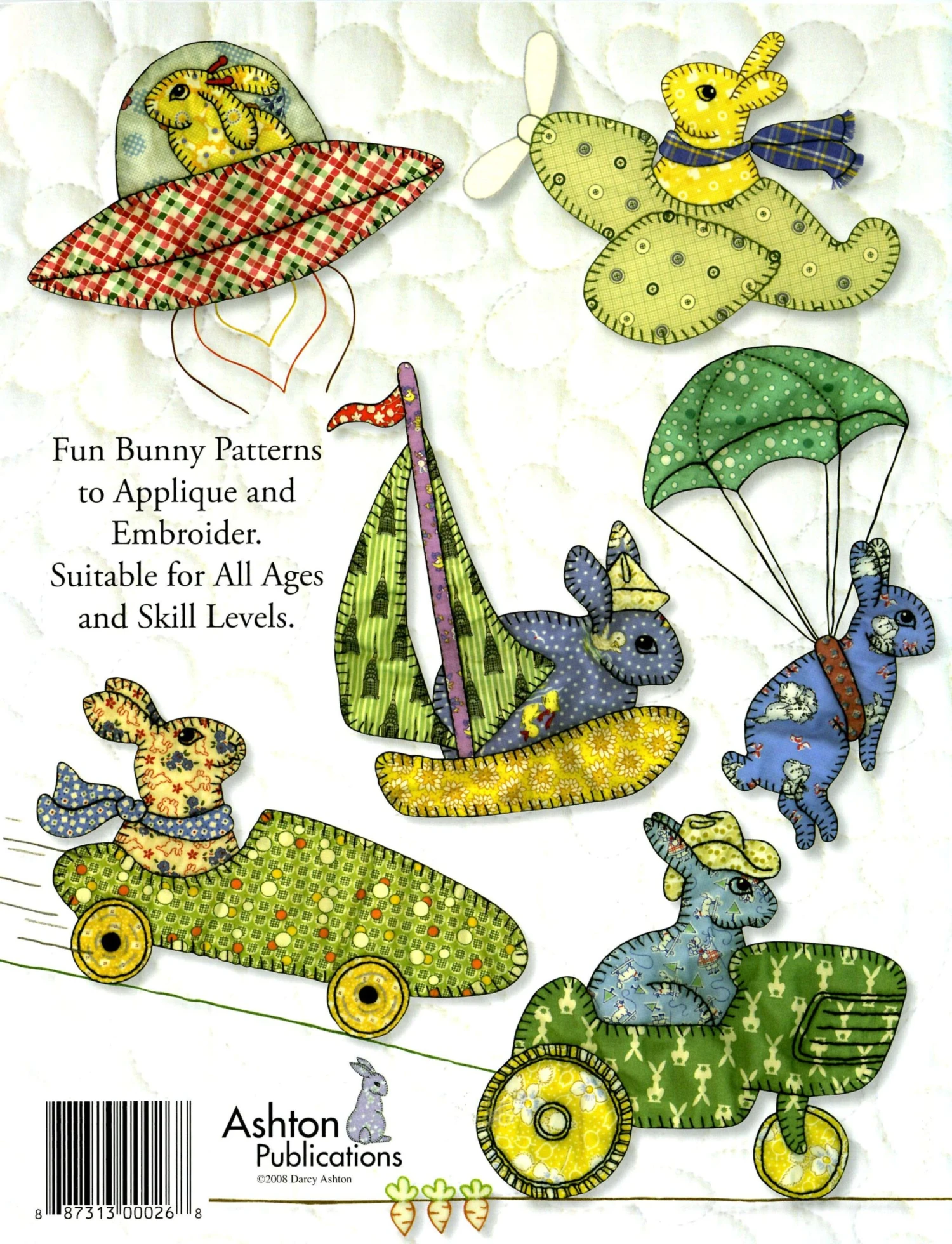 Bunnies and More has two different styles of patterns, it’s like two books in one. There are realistic looking rabbits that can be sewn from one big piece of fabric or adorned with mini quilt blocks, bows, cowboy hats, and bandanas. The other style is more light hearted, with rabbits in vehicles. They include bunnies in an airplane, a soapbox derby car, a parachute, a flying saucer, a tractor, and a sailboat. This book also has eleven different quilts to make from the detailed step-by-step instructions. Please see the quilt gallery link for photos of all the quilts.