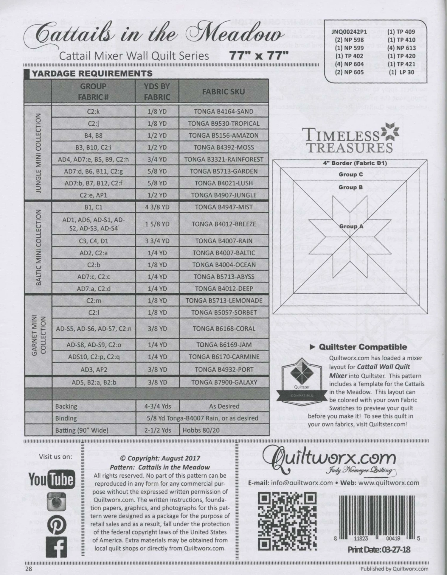 This pattern is an update of our original Cattails in the Meadow design. The two patterns are NOT compatible. This version has standard sized blocks that can be mixed and matched with other blocks. This pattern includes (6) laser cut Stitch-N-Peel applique stabilizer sheets for the stems and cattails. Pattern Includes: Instructions, Cover Sheet, Yardage Information, Foundation Papers. Finished Size: 77 inches x 77 inches. Fabric not included.