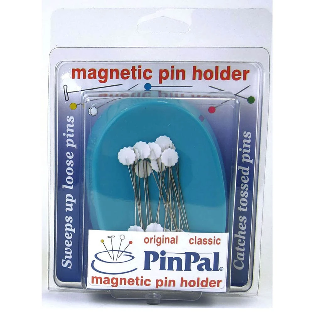 6 1/4in x 4 3/4in x 1 1/2in magnetic pin holder. Comes with 25 white flower quilting pins. Sweeps up loose pins. Sick of messy and dropped pins? PinPal magnetic pincushion is the answer to organizing all kinds of pins and needles. The powerful magnetic field orients pins and needles in a line so they are easy to pick up. the magnet is so strong that you can toss a pin or needle toward the bowl surface and PinPal will Catch it. And sweep over loos and dropped pins and Pinpal snaps them up instantly.