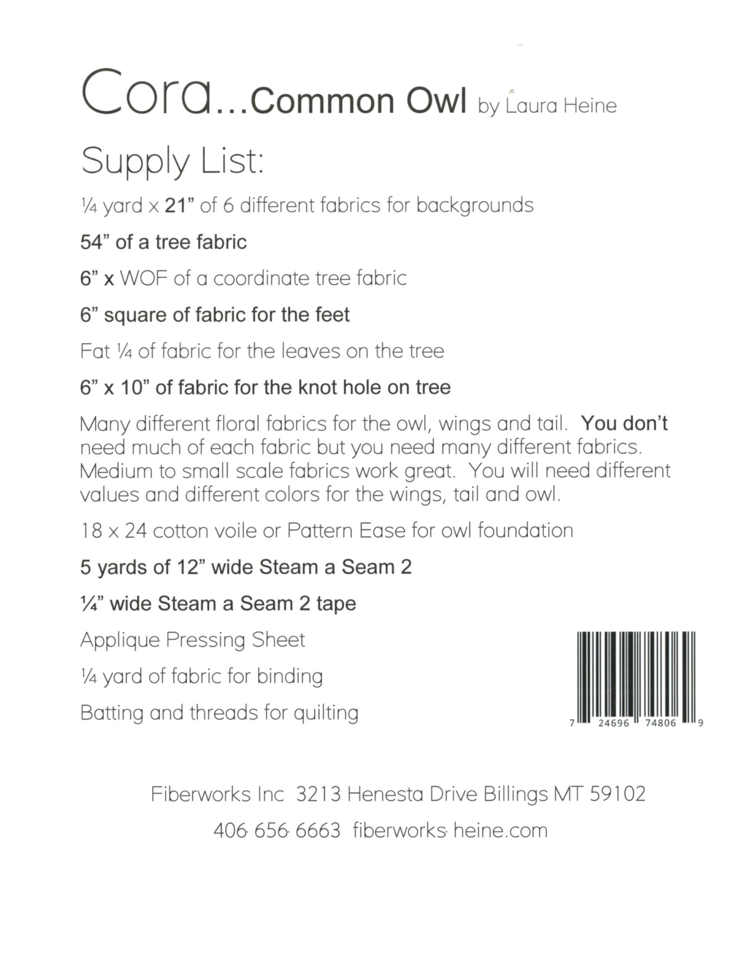 Cora the common owl collage pattern features full sized patterns and complete instructions to complete the quilt. Finished Size: 21 inches x 45 inches. Fabric not included.
