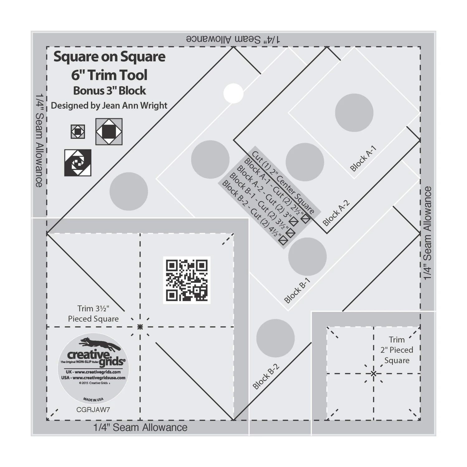 Create 3 inch or 6 inch Square on Square blocks. No calculation needed – all the cutting measurements are printed right on the tool! Trimming each round as triangles are added creates perfectly square, uniform blocks. The popular Snail’s Trail block is now easier than ever – simply change the colors of the triangles! The template comes with fully illustrated step by step instructions or scan the QR Code printed on the template to view a video demonstration. The CGRJAW7 ruler slides easily over the fabric until pressure is applied. Then, our exclusive gripper holds the fabric in place while cutting, eliminating slipping and miss-cuts!