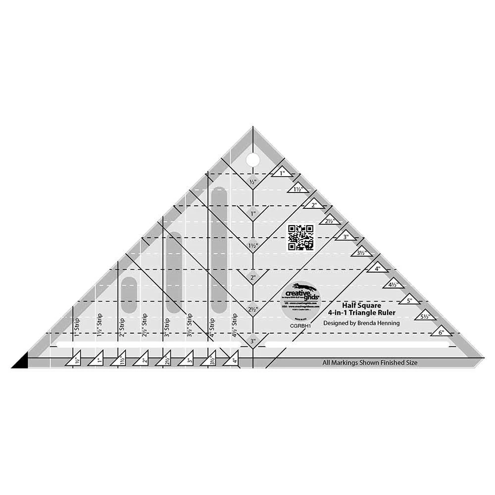 Create half-square triangles (HST) in multiple sizes using the same tool. Whichever technique is used in the pattern you choose can be completed with this ruler. Instructions show four different ways to sew HST’s. Method #1 – Create eight half-square triangles out of a set of squares. Method #2 – Cut ready to sew sets of triangles from strips. Method #3 – Mark and Sew 1/4″ seam lines. Method #4 – Trim Over-sized HST’s to the correct size. Choose the method that works best for you.