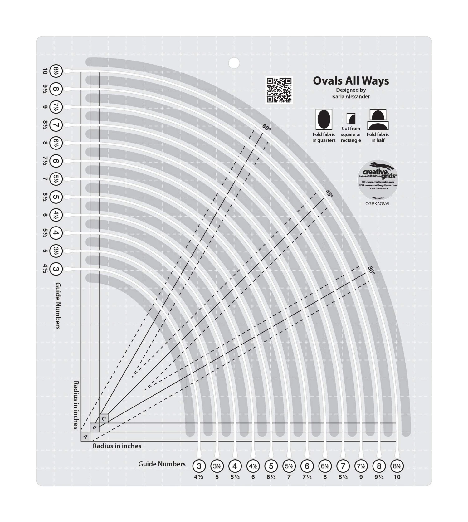 The Creative Grids® Ovals All Ways Ruler cuts ovals, semi-ovals, and quarter-ovals from 3 in x 4-1/2 in to 8-1/2 in x 10 in and every half-inch between. Since this ruler is designed to be used in multiple ways, additional markings are included to for techniques such as fusible applique, piecing and turned-edge applique. The ruler comes with fully illustrated step by step instructions or scan the QR Code printed on the ruler to view a video demonstration. The CGRKAOVAL ruler slides easily over the fabric until pressure is applied. Then, our exclusive gripper holds the fabric in place while cutting, eliminating slipping and miss-cuts!