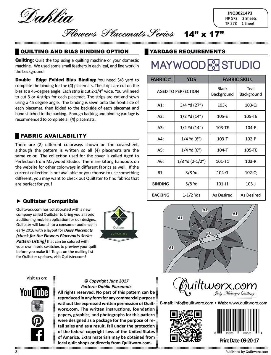 Dahlia Placemats are part of the Flowers Series. The pattern includes enough foundation papers to complete (4) placemats. Quiltster compatible. Finished Size: 14 inches x 17 inches. Fabric not included.
