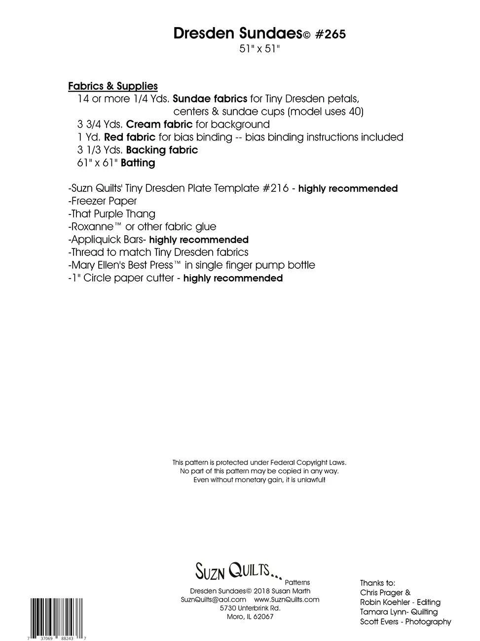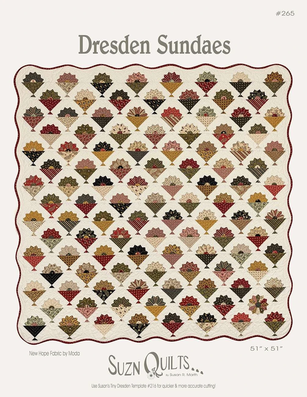 Dresden Sundaes features Dresden Plates in pieced baskets. Requires the Tiny Dresden template (Part # SUZ216) to complete. Finished Size 51 inches x 51 inches. Fabric not included.