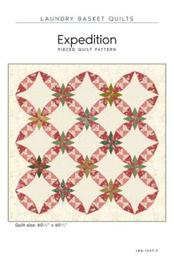 Expedition Pieced Quilt Pattern by Laundry Basket Quilts. Quilt size is 60.5in x 60.5in. Perfect for any level quilter! This quilt is great for the holidays! Quilt can be made with Laundry Basket Quilts’ Alaska Ruler (CGR-LBQ1), Alaska Templates (LBQ-0725-T), or paper templates included with pattern.