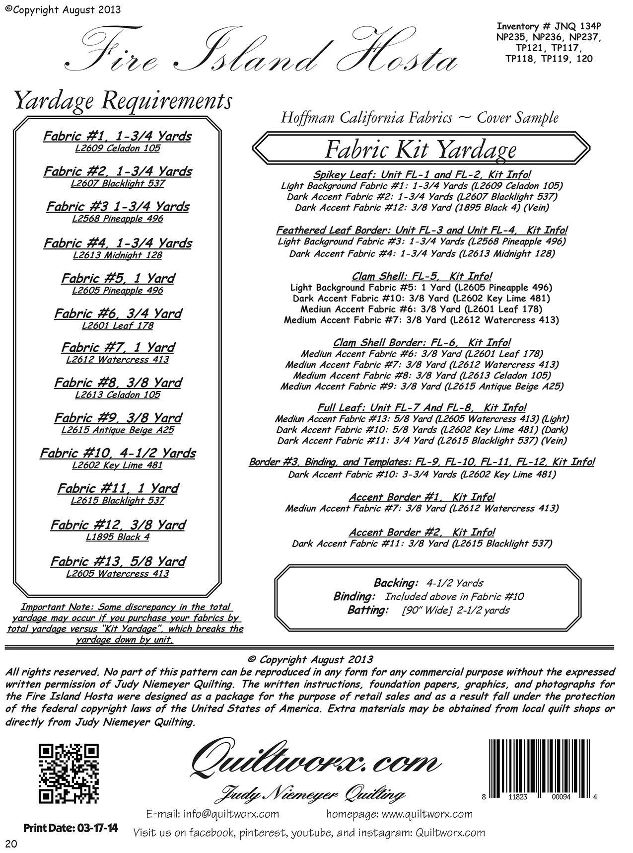 Fire Island Hosta is a foundation paper pieced pattern. Instructions include yardage and exact color references to the coversheet, along with information that will allow you to pick your own colors for the different areas of the quilt. Quiltster compatible. Finished Size: 74 inches x 74 inches. Fabric not included.