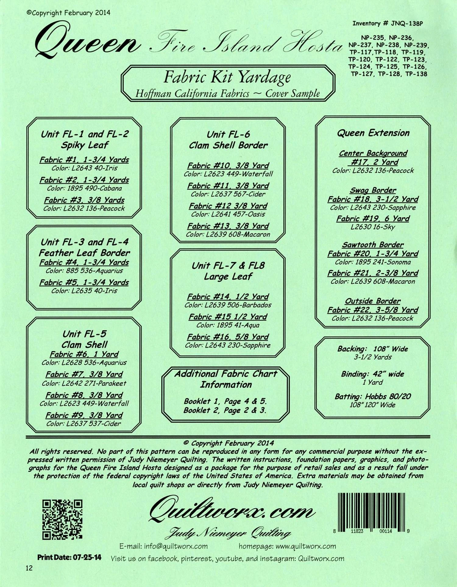 Fire Island Hosta Queen is a foundation paper pieced pattern and incorporates traditional piecing and curved piecing techniques to join the units after the foundation piecing is completed. Pattern Includes: Instructions, Cover Sheet, Yardage Information. Quiltster compatible. Finished Size: 100 inches x 100 inches. Fabric not included.