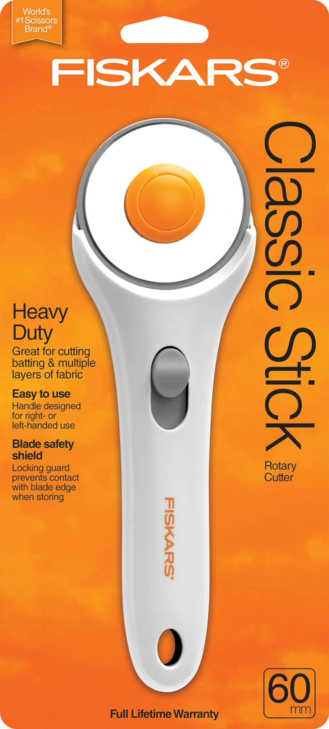 This classic stick rotary cutter can be used left or right handed without changing the blade assembly. The blade guard is locked in place until the summary is pressed. This heavy duty cutter is great for cutting batting and multiple layers of fabric. Sharp, long lasting blade made of premium steel is easy to change.