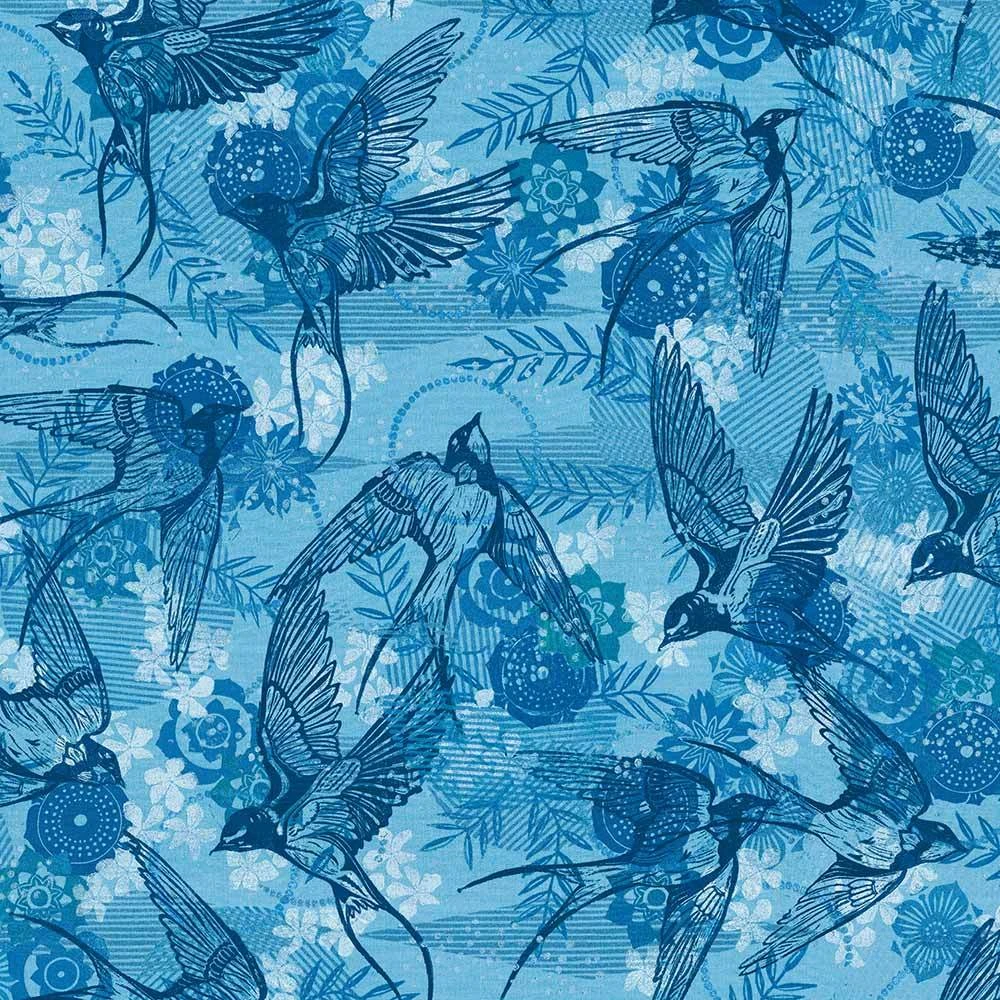 The Coming Home 108″ wide print in Indigo is by Valori Wells and is a rich, deep blue fabric perfect for quilting and other textile projects. It combines vibrant color with an elegant design.