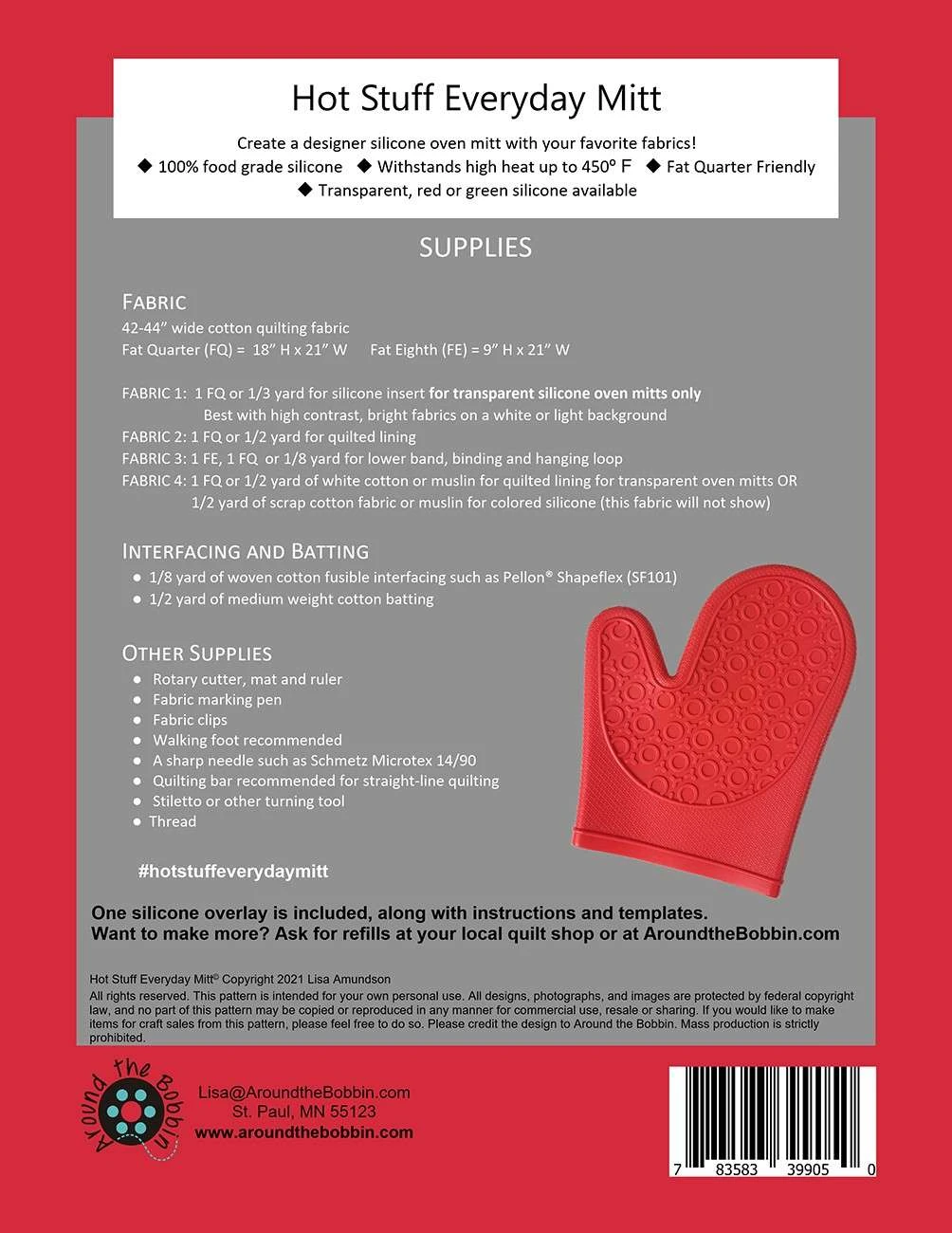 Create a designer silicone oven mitt with your favorite fabrics. Red silicone overlay, instructions and templates included. Makes one oven mitt approx. 12in x 7-1/2in. Silicone overlay is 100% food grade silicone and heat resistant up to 450 degrees. Has a great grip and can be washed off in the kitchen sink. Refill silicone overlays available.