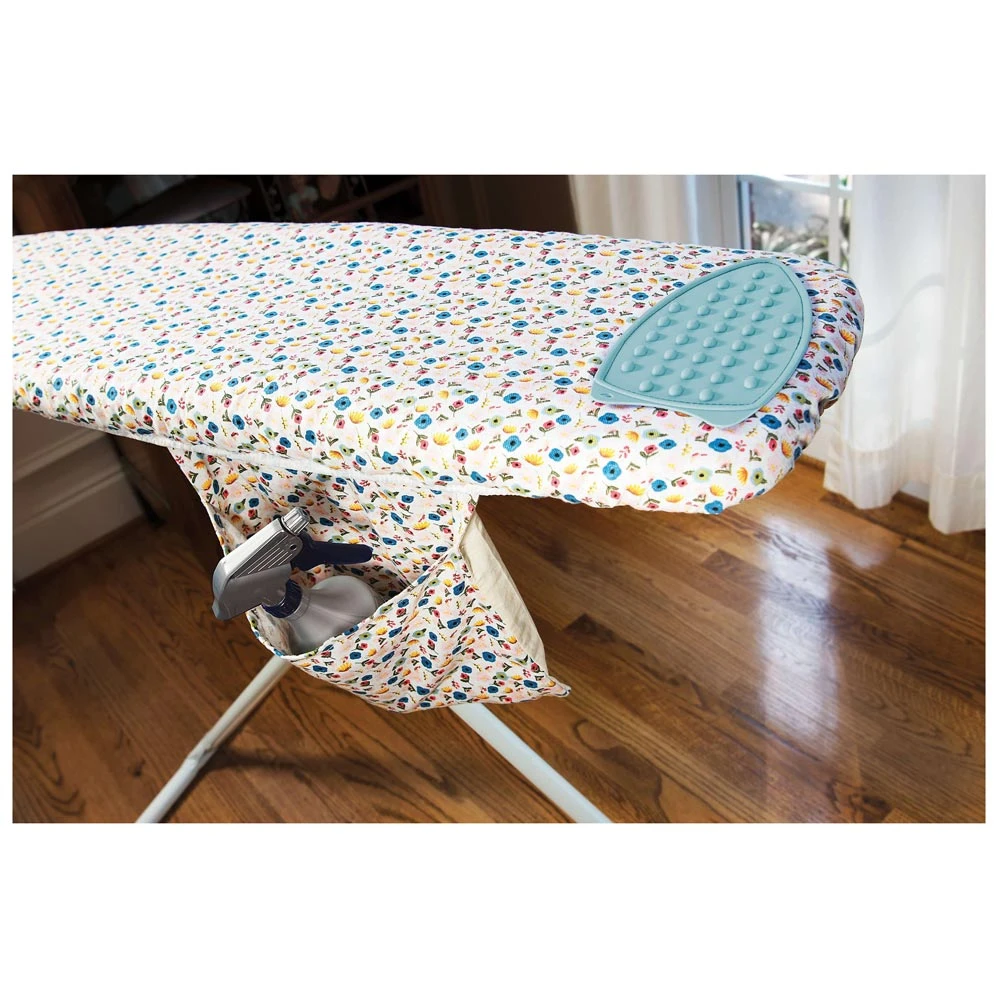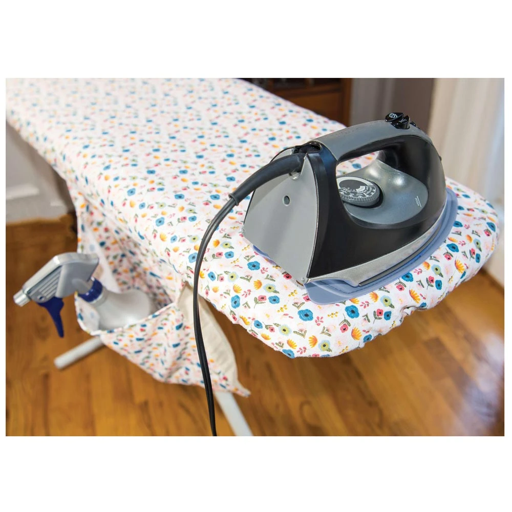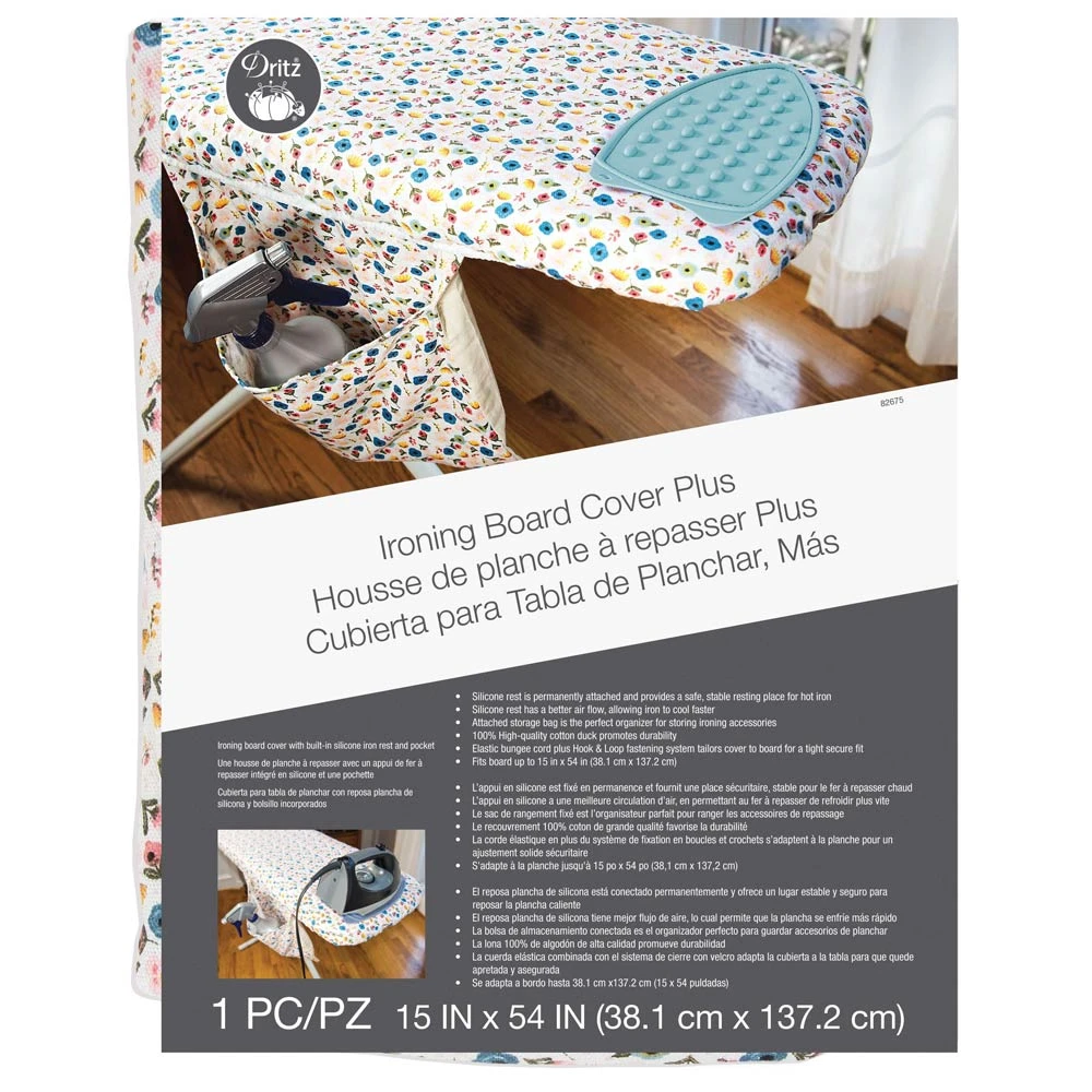 The Dritz ironing board cover plus is designed with a built-in silicone iron rest and an attached pocket for storing other pressing supplies. Helps keep all your supplies handy and within reach