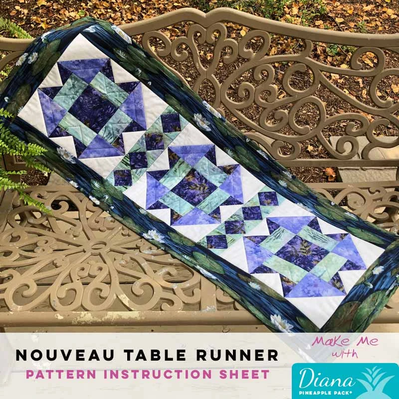 Make this nouveau 18″ x 48″ table runner with one Diana Pineapple Pack, a piece of batting slightly larger than the top, 1 1/2 yards of backing fabric and 1/3 yard of light-colored background fabric.