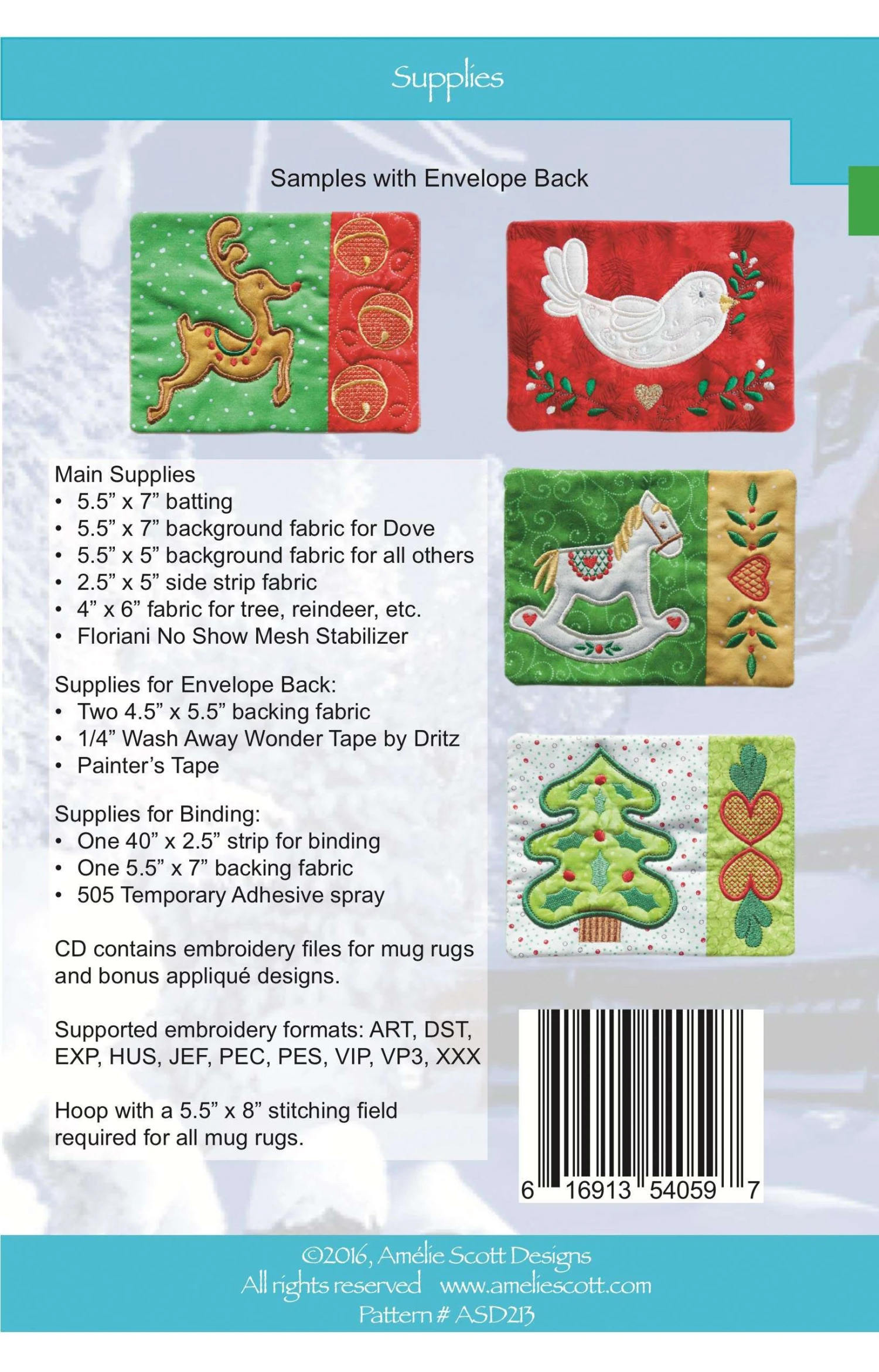 Old World Christmas Mug Rugs pattern includes a Christmas Tree, a Rocking Horse, a Dove, and a Reindeer. The pattern includes digital embroidery files for all major machines, step-by-step instructions with photographs, and bonus applique designs that you can use on other projects. An embroidery hoop with a 5.5 inch x 8 inch stitching field is required. File formats in the included Digital Download are: ART, DST, EXP, HUS, JEF, PEC, PES, and VP3. Fabric not included.
