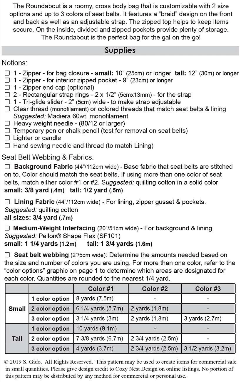 Introduce your customers to something new! Stitch up a seat belt webbing Roundabout Bag! This kit contains pattern, seat belt webbing, and strap hardware – just add fabric, interfacing and zippers. Seat belt webbing is extremely durable, easy to clean, and easy to sew on a home machine. The Roundabout Bag is a roomy, cross body bag that features a braid design on the front and back, adjustable strap, zipped top, and multiple interior pockets. The kit is for a tall bag measuring 11 x 10 x 2¿ and the webbing is Steel Blue. Skill level: Advanced Intermediate.