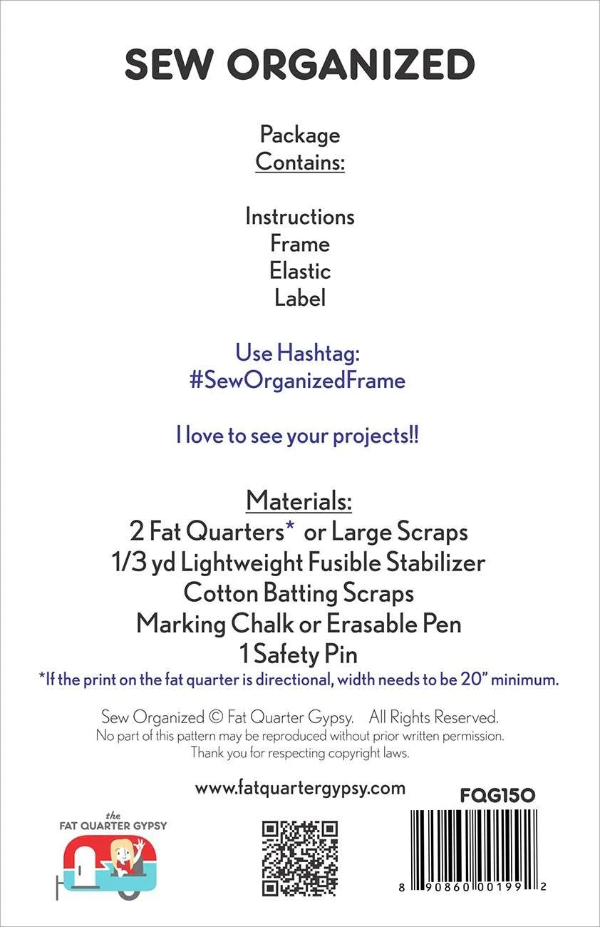 Kit includes: Instructions, Frame, Elastic and Label. Uses 2 fat quarters or large scraps and stabilizer. Size: 5-1/2” x 8-1/2” x 2-1/2″. Goes together quickly! This would make a great class or online sew-a-long.