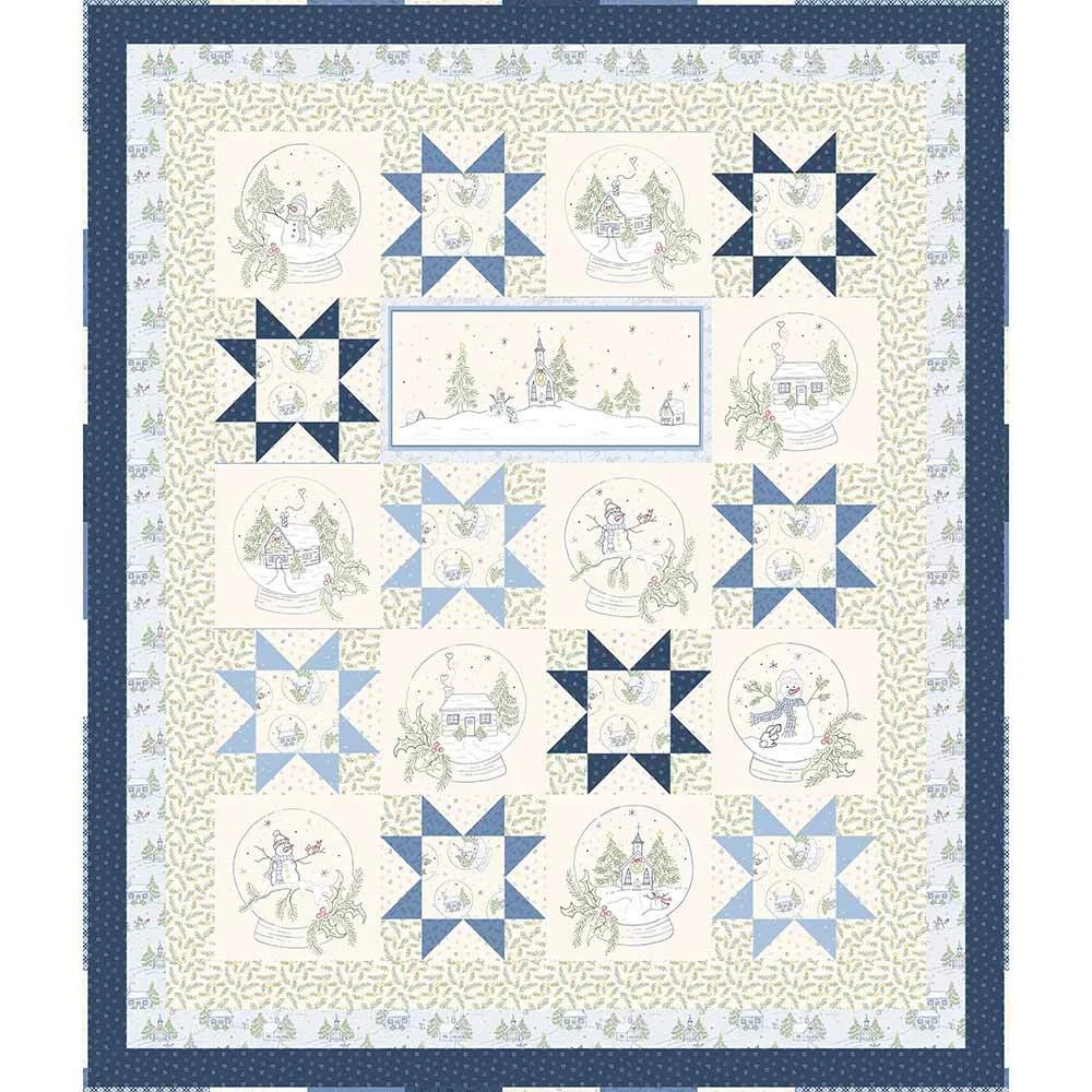 Shades of blue and cream and snowglobe prints make for a charming winter project. The Snowman’s Village Kit includes pattern from Marcus fabrics and all the fabrics needed, including panels, for the top and binding from the Snowman’s Village collection by Cindy Staub for Marcus Fabrics. Finished size is 42″ x 51″. Backing available separately, 4 yards x 44″ wide recommended.