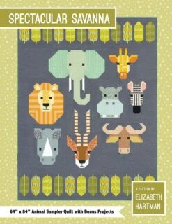 Piece a spectacular sampler quilt featuring iconic savanna animals including an elephant, lion, rhino, gazelle, wildebeest, hippo, giraffe, and zebra. All blocks are sewn using conventional patchwork techniques. One piece (the rhino’s horn) uses a cutting guide a shortcut method to make this shape without the bother of paper piecing or matching points. The pattern book includes complete instructions for making a 64” x 84” sampler quilt, plus bonus quilt and pillow projects using the individual blocks. This pattern uses fat quarters and fat eighths and is perfect for a block of the month program.