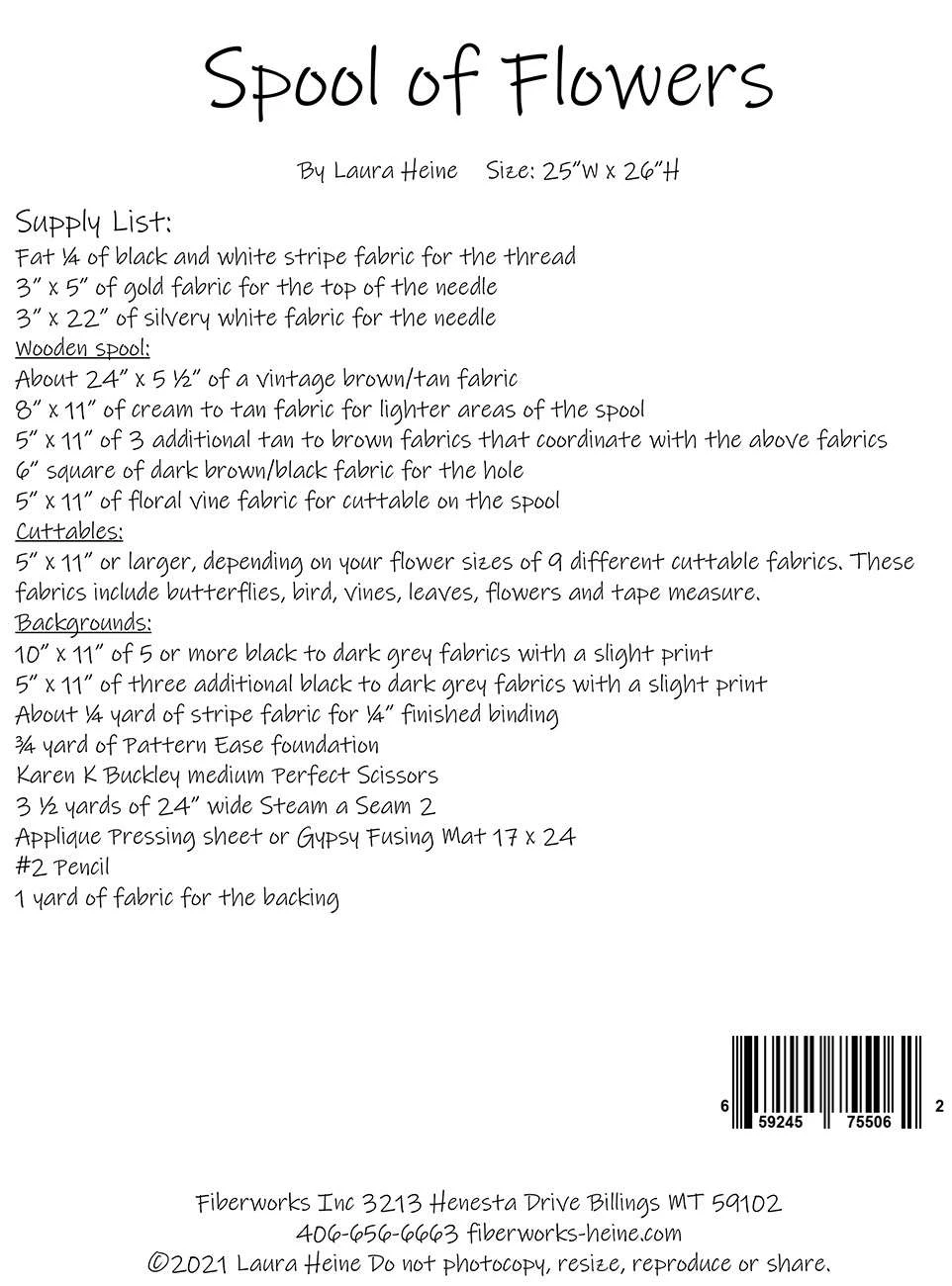 Spool of Flowers Collage Pattern by Laura Heine. This is a MUST have for your sewing room. With black backgrounds, antique looking material for your spool and beautiful flowers on the thread. This pattern includes colored photos and step by step instructions to complete this quilt. Finished size 25×26.