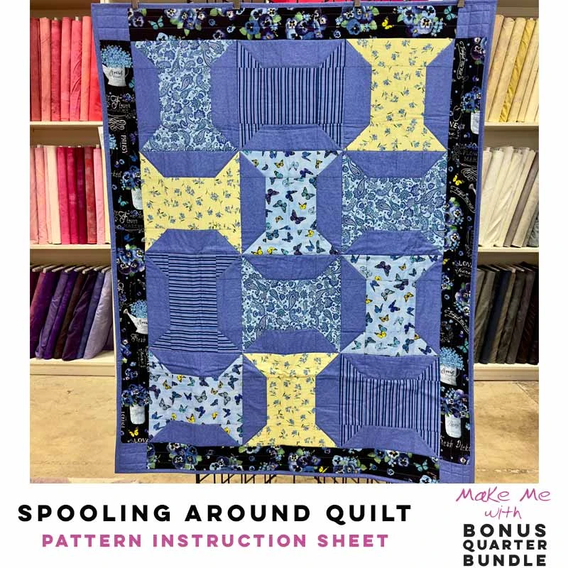 Pattern instruction sheet (digital download) to make the Spooling Around Quilt. One Six-Piece Bonus Quarter Bundle can make this project sheet.