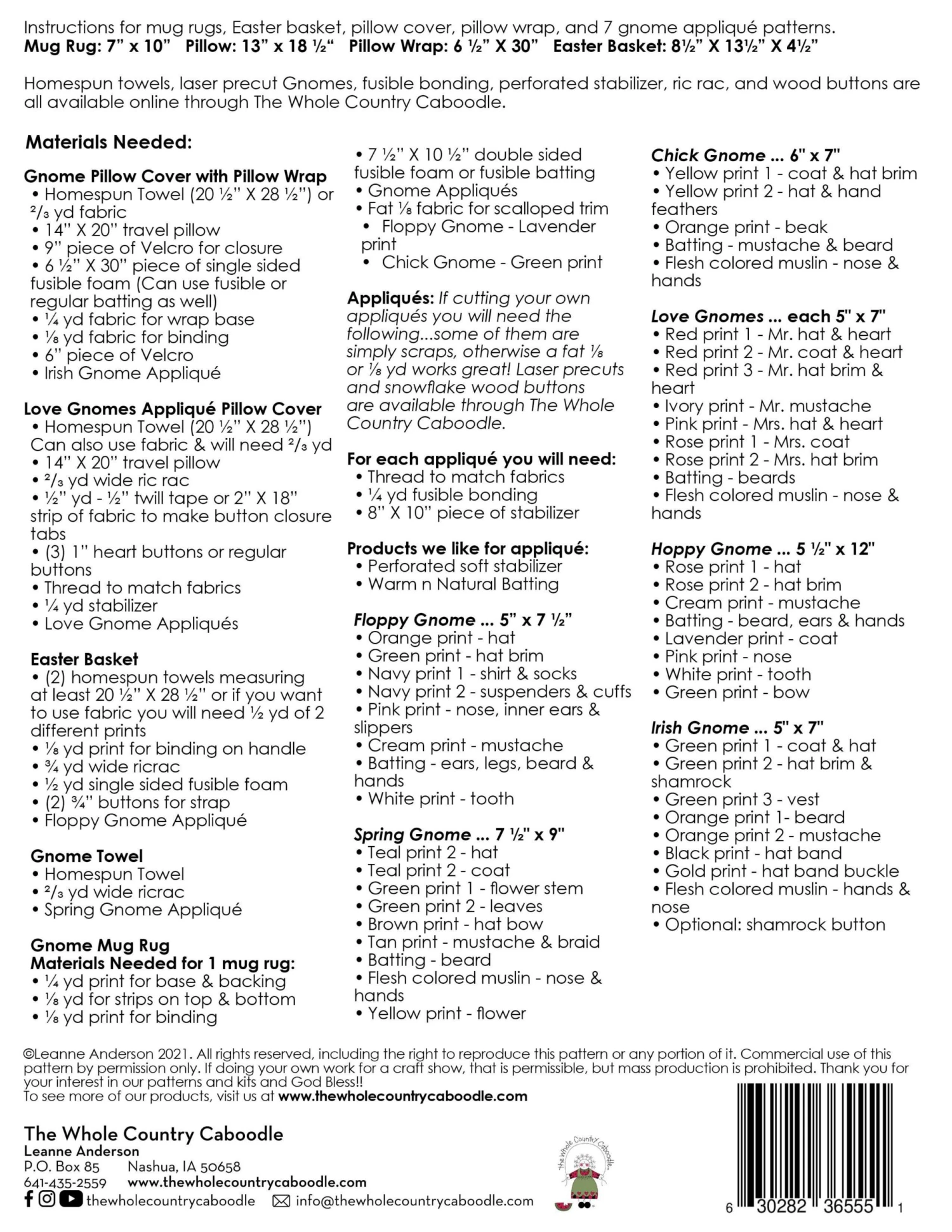 Pattern includes instructions for mug rugs, Easter basket, pillow cover, pillow wrap, towel project, and 7 gnome appliqué patterns.