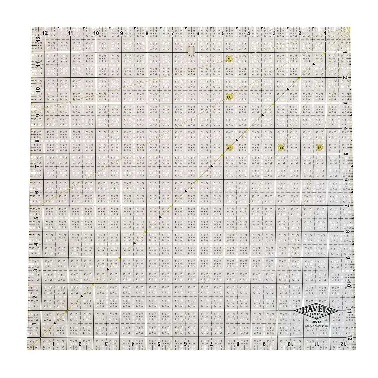 Square Fabric Ruler 12-1/2in x 12-1/2in Measured to 1/2in for easy quilt math. Helps with cutting, squaring and trimming. Marked for both right and left handed use. Two color design makes lines easy to follow. Non-slip backing prevents sliding