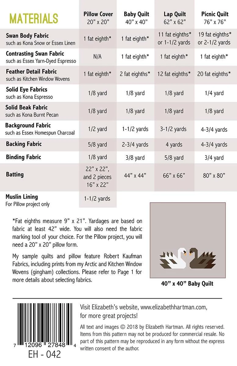 Patchwork swan pattern featuring 76in x 76in picnic quilt, 62in x 62in lap quilt, 40in x 40in baby quilt, and 20in x 20in pillow projects. All projects are made using conventional patchwork techniques. No templates or paper piecing.