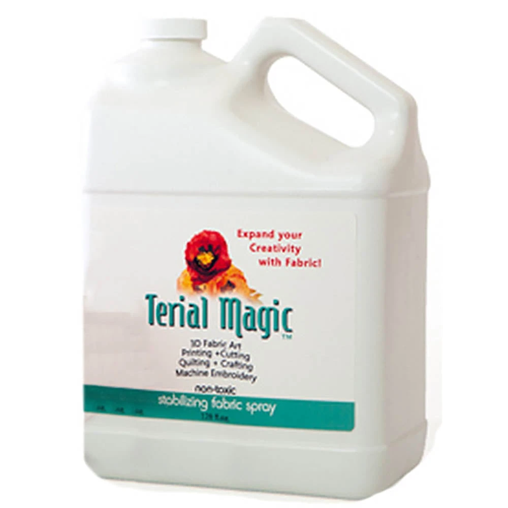 Terial Magic allows you to play with single ply fabric in a whole new way. It replaces stabilizers and fusibles for quilters and embroiderers, keeps fraying in check for scrapbookers and crafters and gives the fabric a firmer hand for holding shapes and folds for all fabric projects. It is quickly becoming a household product suitable for any quilter, sewer, crafter, embroiderer or other DIYer’s toolbox! Treat your fabric in 3 simple steps…spray or soak, air dry and iron! Terial Magic lasts, but is water soluble and can be washed out if desired. For more permanence and water resistance use a clear matte acrylic spray finish on finished art.