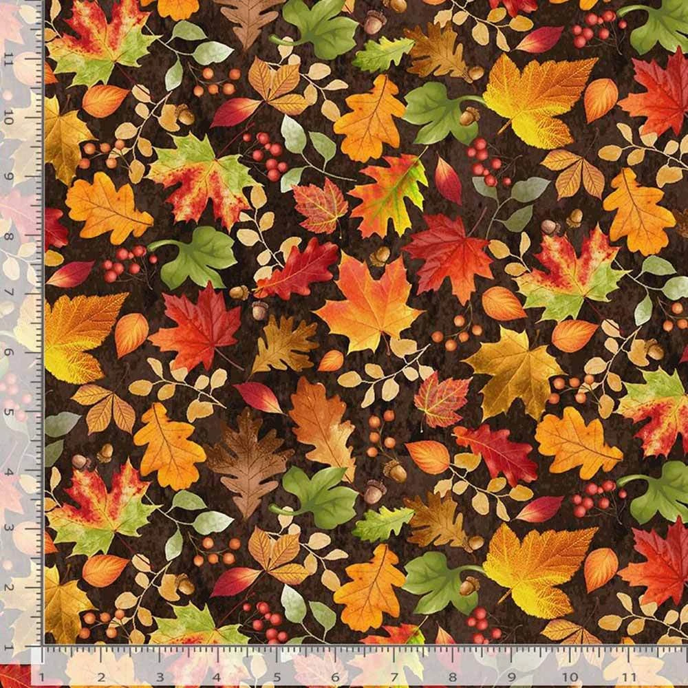 Timeless Treasures’ Gather with a Grateful Heart is a fall-themed fabric collection celebrating autumn’s beauty. It features motifs like pumpkins, maple leaves, and acorns in earthy tones such as burnt orange, brown, and green.