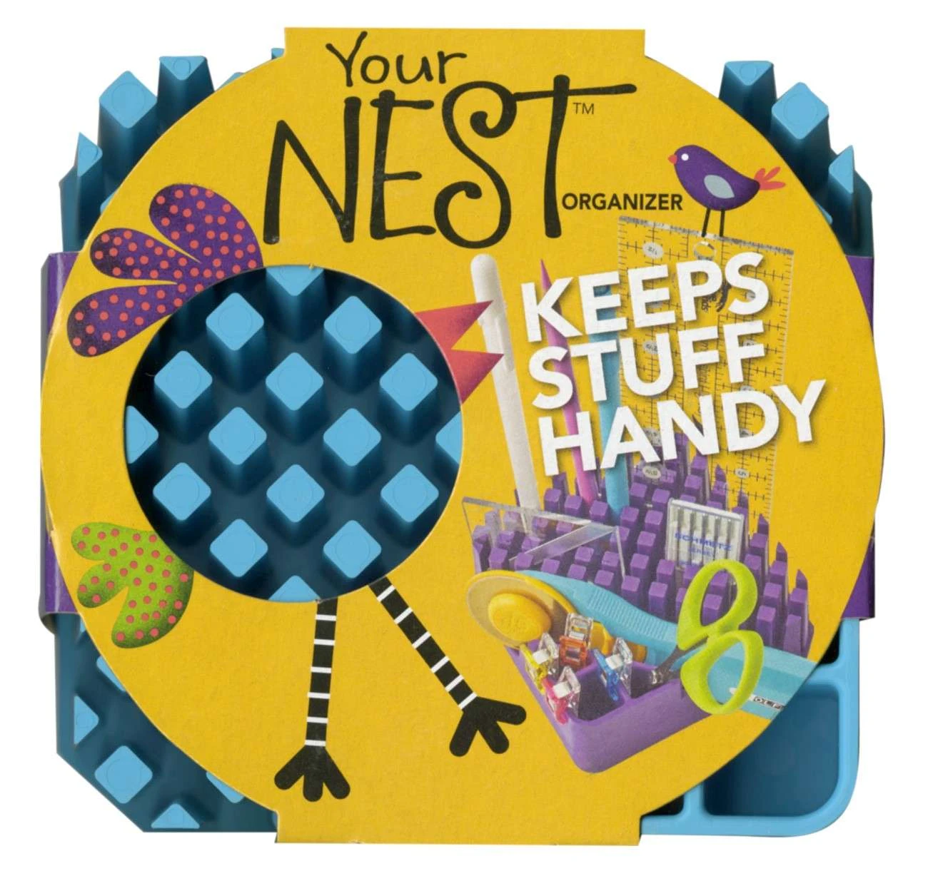 Your Nest Organizer keeps stuff handy in your craft room, on your desk, or anywhere in your home or office. Store favorite tools like rulers (any size!), patterns, envelopes in the stand-up peg area. Place your rotary cutter, glasses, cell phone, and larger objects in the scoop. And put your pointy stuff like scissors, pens, pencils, flash drive in the spaces up front. 4-1/2in x 4-1/2in x 1-1/2in. Aqua/Blue.